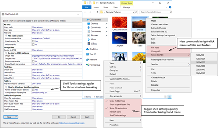 Shell Tools is a free Windows extension that adds the following new commands to right-click menus of files and folders: