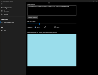 Generate secure passwords and keys by using a random algorithm in combination with random user input from your mouse or touchscreen. Choose between password length and other options. Generate random keys in hexadecimal exponential notation with length from 16 bit to 1024 bit.