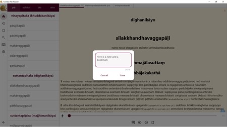 This application contains the Pali Tipitaka and commentaries from the 6th Buddhist Council. It has several dictionaries to help assist one in reading the ancient Buddhist language. This application has integration with the Digital Pali Dictionary and also the Pali English Ultimate.