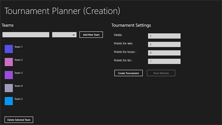 With this app you can plan your own little tournament. You can create up to 8 teams and specify the number of fields you can play on at the same time. Then the app will create a playing schedule (all against all) and a ranking. You can start the games and edit the score/points for each team. After you end the game the new ranking is calculated. You can use this app in various sports or tournaments where two teams or players play against each others. Use it for Soccer, Tennis or Floorball Tournaments. Just to name a few. You can choose how much points a team can get if it wins, loose or if the game is a tie. Also you can choose the order of the ranking.