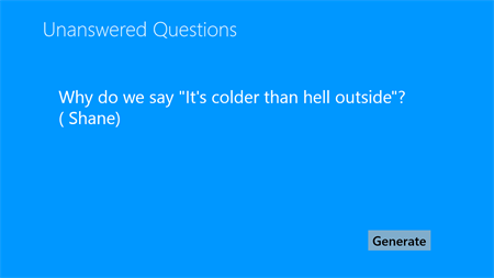 Unanswered Questions brings you the world's most weirdest unanswered questions of all time ! Generate random questions at work, home or even in your free time.