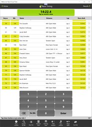 Four timing views + Normal view: tap once to record both time & racer + Fast-tap view: tap time stamp, then tap racer + Keypad view: tap time stamp, then use keypad to enter bib + Scanner view: use Bluetooth scanner to read QR code or RFID chip Tap multiple time stamps, then tap racers in order of finish You can also pre-enter the racer, then tap the time stamp Easy to correct mistakes, edit results in place