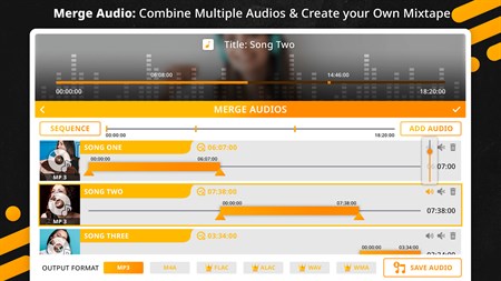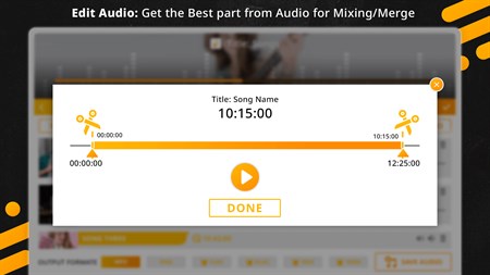 => Audio Merge/Joiner: Mix two Audios of any format to create new remixes. You can select the part of Audios you want to mix and you can also control the volume of both audios in your mashup. Preview your creation and save your mixes.