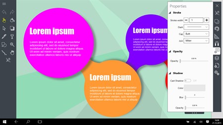 Vector drawing tool with nondestructive Boolean operations, smart shapes, gradient fills, shadows and so on built exclusively for tablets and hybrid devices on Windows 10.