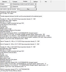 Astrology calculations, based on selected date. Geocentric and heliocentric calculations. Calculates horoscopes, based on selected hosrocope data - yearly solar revolutions (return), moon elongation (monthly moon returns, prenatal epoc (conception horoscope), moon phases, eclipses (sun & moon), planets rise/set horoscopes, progressions/secondary directions (year, month, week, day). Single horoscope analysis: - Graphically printed astrocard - detail information, animation mode included - Magnetism(compact information), based on sun, moon and stars. - Transits analysis against planets and houses of selected date (planets & fixed stars transitions) - Calculates primary astrological directions (mundane, zodiacal), against house angels, planets, parallels, etc...) - Planets & Houses analysis. - Planets detail analysis. - Vedic astrology - Biorhythm calculation Two horoscopes compare analysis: - Graphically printed astrocard (both, each other) - detail information, animation mode included! - Planets & Houses compare analysis. - Planets compare detail analysis. - Biorhythm compare calculation - I-ching astrology! Pre-Heaven / Later-Heaven / Yearly / daily hexagrams. Meaning, Analysis, Predictions. - I-ching numerology - calculation using early and later trigrams formulas - maintain horoscope data