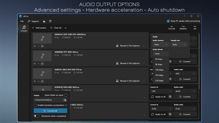 • Enable hardware acceleration to save time. • Auto shutdown when completed. • Save time with multiple files processed at once or focusing on a single audio.