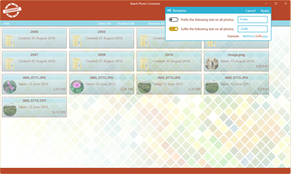 Batch Photo Converter has been exclusively designed as a Universal App for Windows 10 to provide the best possible experience; it's safe, secure, reliable, touch enabled and easy to use with a modern, clean user interface. From a single photo, to archives of hundreds of thousands, conversion is easy and safe.