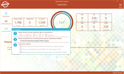 Batch Photo Converter is secure by default, it will never overwrite your original photos. It creates converted copies, while optionally replicating folder and file names. This flexibility enables you to merge everything into one consolidated archive, or just a few photos for a project into a single folder.