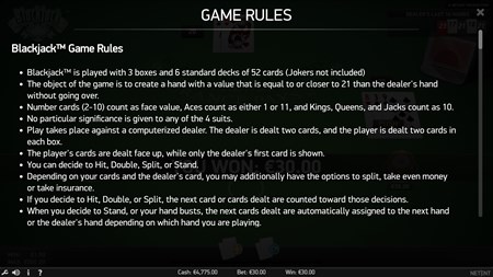 - Blackjack is played with 3 boxes and 6 standard decks of 52 cards (Jokers not included). - The object of the game is to create a hand with a value that is equal to or closer to 21 than the dealer’s hand without going over. - Number cards (2-10) count as a face value, Aces count as either 1 or 11, and Kings, Queens, and Jacks count as 10. - No particular significance is given to any of the 4 suits. - Play takes place against a computerized dealer. The dealer is dealt two cards, and the player is dealt two cards in each box. - The player’s cards are dealt face up, while only the dealer’s first card is shown. - You can decide to Hit, Double, Split, or Stand. - Depending on your cards and the dealer’s card, you may additionally have the options to split, take even money or take insurance. - If you decide to Hit, Double, or Split, the next card or cards dealt are counted toward those decisions. - When you decide to Stand, or your hand bursts, the next cards dealt are automatically assigned to the next hand or the dealer’s hand depending on which hand you are playing.
