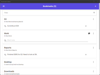 As a computer user, you usually need to manually locate a certain folder or collection of folders. This tool lets you save, edit, add note, and manage a list of those folders' locations, then you can quickly filter/locate and launch them.
