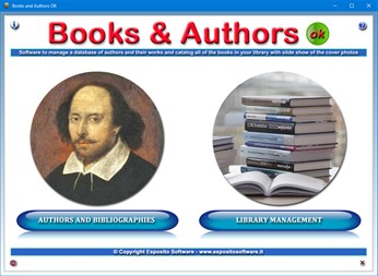 Access to the software is protected by a user-customizable password that can be changed as often as desired. For the first access to the software, you must use the keyword "password" (written without the quotation marks). If you forget your password, send an e-mail to the author of the software at info@espositosoftware.it using the sentence "Forgot login password for Books and Authors OK" as a subject line. In response to your e-mail, you will receive instructions to reset your password.