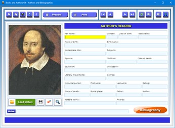 The Authors and Bibliographies app is designed to store the biographical and bibliographical information of your favorite authors indicating, of each of them, their pen and birth names, gender, place and date of birth, nationality, the titles of their masterpieces and the subjects they deal with, other notable works, their spouses, children and parents, their dates of death and burial places if they are authors of the past, their education and occupation, the literary movements and genres they are generally associated with, the historical periods in which they live or have lived, the first and last work they wrote, the literary awards they received, an evaluation of their literary skills, and any additional biographical notes.