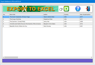 The Export to Excel button allows you to export the textual data present in the book database into a Microsoft Excel worksheet, which can be opened with any software capable of managing files in XLS format (for example, with Open Office, Libre Office or Microsoft Office). After opening the window containing the data grid, click on the Excel icon. This operation creates in real time a file in XLS format containing the records of the books in the database, which can be opened immediately by answering affirmatively to the question message that appears. At this point, you can save the file on your hard disk and name it as you wish.