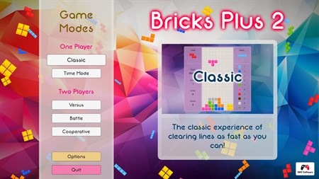 In this version you will have the possibility to play 5 different game modes: - Classic: The classic experience of clearing lines as fast as you can! - Time Mode: Play with a countdown that will test your skill! - Versus: The classic experience for two players. - Battle: Use the lines on your board to attack your opponent! - Cooperative: One board, two players, double the fun.
