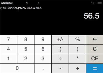 Laskin - sulkeita, yhteenlasku, vähennyslasku, kertolasku, jakolasku.