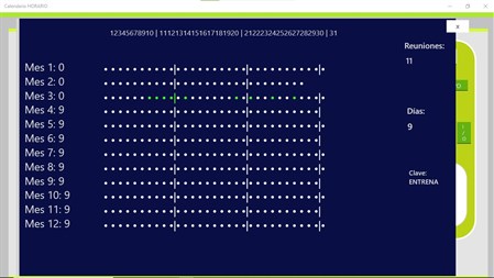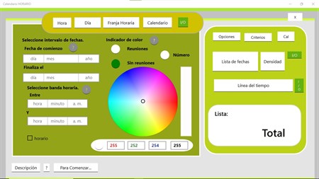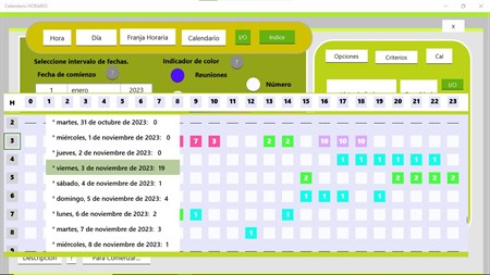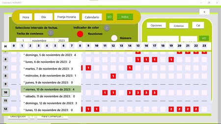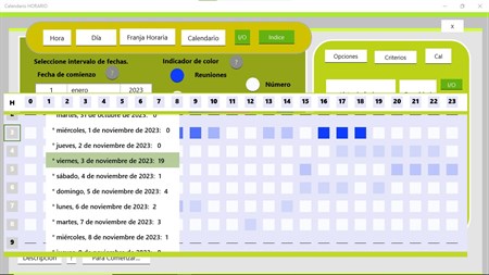 Calendario horario. Esta aplicación es el complemento para las aplicaciones Consultas(Queries) y Agenda Permite hacer consultas de las reuniones del calendario de Windows En función de la hora del día. Genera una grilla de 24 horas(columnas) y de la cantidad de días que establece en el rango de criterios(filas). Una vez que genera la grilla puede indicar visualizar día completo en el calendario Determinada hora que usted marque O entre las 2 fechas que indique, Una horario determinado Así puede ver un día en el calendario de Windows Y también la lista de reuniones Entre rangos y horario.