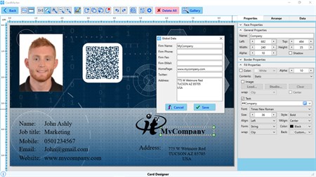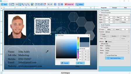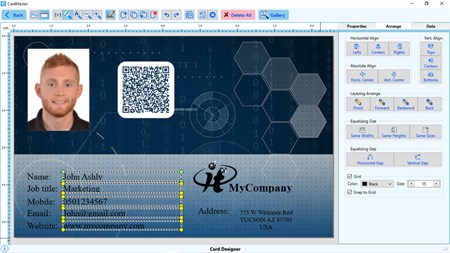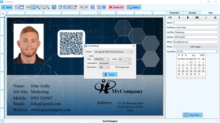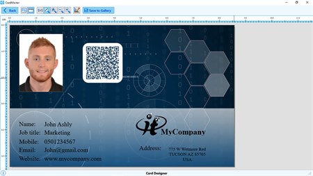 ► Features: - Built-in cardholder record database for unlimited number of records (in full edition). - Advanced database designer which includes (Template Fields, Required constraint, Unique constraint, Default Value, Built-in Functions, ReOrder & ReName Fields, 8 Supported Data Types). - "Default Value" attribute of Database field with several Built-in functions to choose from. - Card designer, background, and fully customizable shapes for beautiful card designs. - Controls colors, opacity, shapes, borders, grid, fonts, sizes, positioning, clipping, truncation..... - Advanced Text truncation functions. - Smart Layering system. - Supports 9 standard card sizes. - Multiple resolution support. - Double side cards. - Print cards in batches or one at a time. - 1D Barcode that supports 24 encoding Standards, including ISBN, fully customizable appearance. - 2D QR Barcode with Dynamic and/or Static Data, customizable appearance, and background image. - Advanced properties editor to precisely control shapes and objects. - Full Alignment, Size and Gap Management controls to quick control positioning of objects. - Static & Dynamic Shapes and fields Support. - Multi-level Undo/Redo. - Image Studio with more than 15 actions & effects, and 4 proportional cropping modes. - Image acquirement from any Image Source including webcam. - Included OCR-A Font readable by Image Scanners for use in Objects. - Global Data Entry, for QR Barcode static data. - Global Data Reference for all static Objects. - Categorized Card Gallery with more than 20 Ready Card deigns for fast startup. - Save & Load Active Card Template through Card Gallery. - Categorized Image Library with more than 400 Backgrounds, Shapes, and Icons. - Selectable reference object for align, resize, & gap management among selected objects. - Named Colors menus with custom color picker & Eye-Dropper. - Data Browser/Editor form while in Card Designer. - Data Import Wizard. - Wizard like Workflow. - UTF-8 Text Support for All world Input Languages Character-set. - Integrated Migration Tools.
