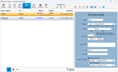 Toistuville tapahtumille (laskut, kulut) määritetään keskimääräinen summa, joka on lähellä odotuksiasi. Kaikki tulokset näkyvät tehokkaalla Projection-sivulla. Tämä sivu näyttää jokaisen toistuvan Tapahtuman esiintymän sille määritettyinä päivinä. Toistuvan tapahtuman jokainen yksittäistapaus Projektio-sivulla voidaan päivittää vastaamaan sen todellista määrää, kun se on tiedossa. Nämä tapahtumat voidaan tarvittaessa siirtää myös toiselle tilille, esimerkiksi luottokortilla maksaessa rahapulaviikkoina. Projektiosivulla voit myös lisätä niin monta kertaluonteista tapahtumaa kuin haluat. Kaikki päivitetyt summat on korostettu helpommin. Yksinkertainen käyttöliittymä pettää ohjelman tarjoaman äärimmäisen tehon ja konfiguroitavuuden.
