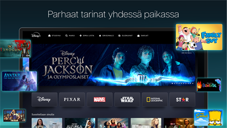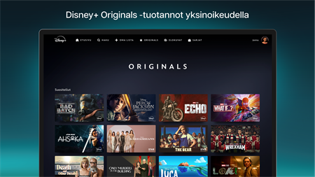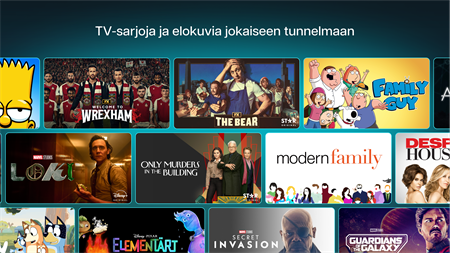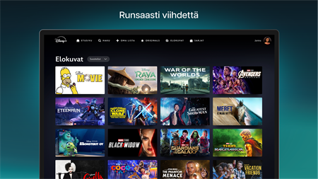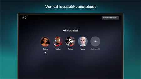 Disney+ tarjoaa sinulle enemmän viihdettä. Rajoittamaton määrä viihdettä Disneyltä, Pixarilta, Marvelilta, Star Warsilta, National Geographicilta ja Starilta pitää huolen siitä, että et ikävysty. Katso uutuuksia, Originals-sarjoja ja -elokuvia, klassikkofilmejä, TV:n suosikkiohjelmia ja vanhoja klassikoita. Katso uusia Originals-sarjoja, kuten The Mandalorianin 2. kausi, ja fanien suosikkeja, kuten Simpsonit ja Frozen. Uusia tarinoita lisätään joka viikko: tarjolla on aina jotain uutta. Disney+ -palvelun edut: • ensiluokkainen katselukokemus • uudet Originals-tuotannot Disneyn, Pixarin, Marvelin, Star Warsin, National Geographicin ja Starin tekijöiltä yksinoikeudella • uutuuksia, ajattomia klassikoita ja suosikkiohjelmiesi aikaisempia kausia • helppokäyttöiset lapsilukkoasetukset • valikoima 4K-laatuista sisältöä (yhteensopiva laite vaaditaan) • mahdollisuus katsoa neljällä näytöllä samaan aikaan • IMAX Enhanced -kuvanlaatu. Saatavilla tietyille Marvel-sisällöille ja käytettävissä kaikilla laitteilla, joilla Disney+ -palvelua tuetaan. Saat apua Disney+ -käyttöön osoitteesta http://help.disneyplus.com. Tilaussopimus ja muut käytäntömme löytyvät osoitteesta: https://disneyplus.com/legal. Disney+ -palvelussa saatavilla oleva sisältö voi vaihdella alueittain. Jotkin yllä mainituista nimikkeistä eivät ehkä ole saatavilla maassasi.