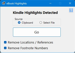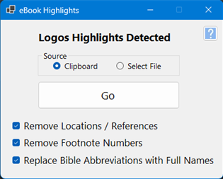 Highlights performs a series of tasks to clean-up and reformat highlights, annotations and notes taken from eBooks. These tasks include: • Identifying the book title and author from the text and properly bolding and formatting these. • Identifying chapter headings and properly bolding and formatting these. • Identifying lines that are references (locations within the eBook such as "LOCATION: 1234" that the text is taken from). Highlights gives you the option to keep or remove these from the final cleaned-up text. • Deleting lines that are extraneous (such as time stamps, citation marks, page numbers, etc.) • Removing separator lines. • Adding parenthesis, periods or quotes to the end of a line when needed. Sometimes, when highlighting these final parenthesis, periods or quotes are cut off from a highlight, so Highlights automatically detecs this and corrects these. • Removing any extraneous characters at the beginning or end of a line. • Removing any in-line footnote numbers (e.g., "This is an example.10"). Highlights gives you the opportunity to keep or remove these from the final cleaned-up text. • Uppercasing the first letter of a paragraph if needed. Sometimes a highlight you want starts mid-sentence, so this is nice to have. • Fixing miscellaneous punctuation problems. • Further, for Christian books, Highlights gives you the opportunity to correct and spell-out any Bible book references (e.g., replacing 'Ex. 5:1' with 'Exodus 5:1').