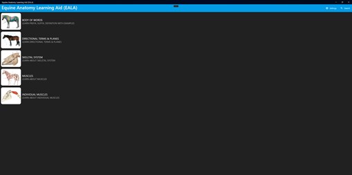 The app supports the text: Anatomy of Equine Bodywork; The Equinology® Approach as well as the EQ50: Equine Anatomy Distance Study course. It is suitable for all students and practitioners interested in learning or reviewing the equine muscles and skeletal systems.