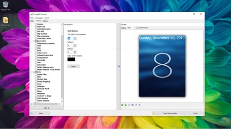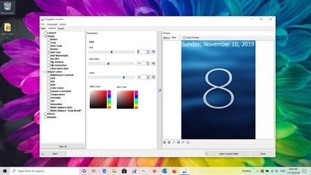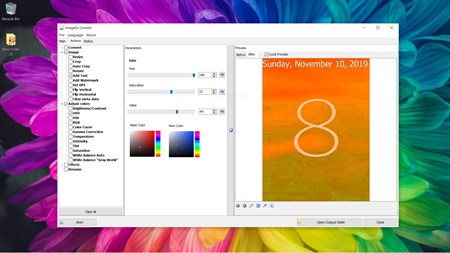 ES image Converter is a program to edit, convert and enhance your images in a batch mode. Edit image: resize, rotate, crop, auto crop, flip, convert to colors. Add text, watermark. Convert from 100+ images formats to 18 images formats including JPEG, PNG, TIFF, BMP, JPEG2000. Adjust colors: brightness, contrast, saturation, intensity, temperature, RGB, HUE etc. Apply effects: filters, lens, bump mapping, wave, blur, sharpen etc. Over 35 actions are supported. App has clear interface; you can also preview all changes before processing.