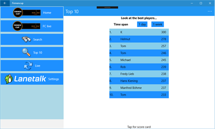 Provides information all about the company cup. The app uses the Lanetalk API to prepare scorecards, stats and live scores. Check if your bowling center is running a Lanetalk client. For scorecards and statistics functions you need an account (free of charge) at Lanetalk. This app is specially designed for the company cup at the DreamBowl Palace in Munich. But the app can also prepare all other results in the bowling center of your choice.