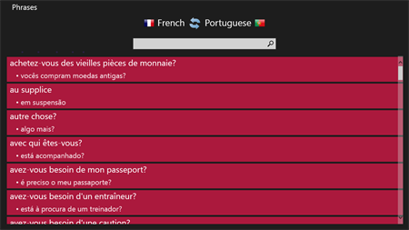 •French → Portuguese 64,000 words and phrases. •Portuguese → French 68,000 words and phrases. •Test, flashcard, listen test, writing, dual game and more... •French ↔ Portuguese translator (online). You can translate text and listen. •800 phrases
