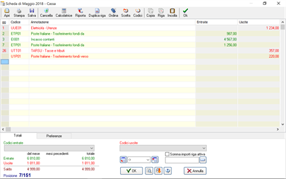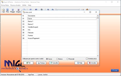 L'utente può gestire tutti i conti di prima nota che desidera, quelli caricati di default sono: Cassa, Banca1, Banca2, Attività, IVA, Fatturato, Carta di credito ma è possibile personalizzarli modificando questi o aggiungendone altri; così come è possibile personalizzare anche i codici movimento aggiornando quelli già presenti.