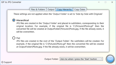 Your conversion, your way. • Create JPG files in a new folder, optionally preserving the original GIF folder hierarchy. • Set the Compression Quality, Transparency color, and file extension (jpg or jpeg) • Create JPG files side-by-side with the GIF files, with the same filename. • Copy the creation and modification dates, or use the system dates.