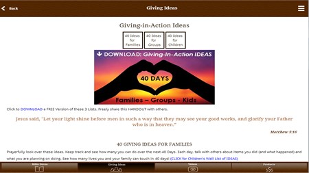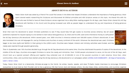 Based on the world's bestselling 40 Day Generous Life Bible devotional. 40 Daily Bible readings with key Biblical financial principles, 10 Bible verses, teaching podcasts, generosity story, and cartoon. Weekly videos and discussion questions for small groups and classes. 40 Giving-In-Action ideas for children, families, and groups. WISE GIVING Q&A videos, inspirational videos, and teaching videos. Great for personal use, couples, families, small groups and classes, or churchwide use.