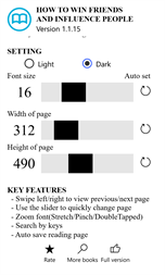 This is Ebook of "How to Win Friends and Influence People". It is one of the first best-selling self-help books ever published. Written by Dale Carnegie and first published in 1936, it has sold 15 million copies world-wide. In How to Win Friends and Influence People, he offers practical advice and techniques, in his exuberant and conversational style, for how to get out of a mental rut and make life more rewarding. This ebook is free to read all pages, but you can buy a In App Purchase to support developer.