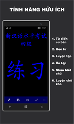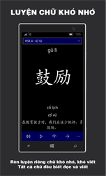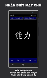Bạn sẽ được rèn luyện song song 4 kĩ năng NGHE, NÓI, ĐỌC, VIẾT thông qua 1.200 chữ Hán của HSK 4: - Luyện NGHE với câu ví dụ được trích từ bộ đề thi HSK; - Luyện NÓI với phần kiểm tra nhận chữ; - Luyện ĐỌC với chữ Hán được phát âm bằng giọng người thật; - Luyện VIẾT với chữ Hán được hiển thị kèm theo thứ tự nét.