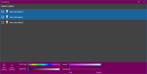 Tips: 1. The app can generate effects with a single bulb. Use three or more Philips Hue color bulbs in the room for an awesome experience! 2. App listens to music using your computer microphone, Make sure microphone is enabled on your computer. 3. Your computer running this App and Hue Bridge should be connected to the same network.
