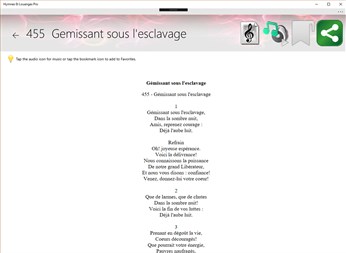 With Hymns and Praise Pro, you now can read the lyrics of "Hymnes et Louanges" song Book in French used. Also Included in this App: +Hymnes et Louanges (French) (Hymns and Praise) book. All the Lyrics come with audio tunes for your listening pleasure. Also included Music scores for all the hymns. This App focuses on helping you Worship. Works well on Phone, Tablets. Features worth mentioning: 1) Audio Tunes for each lyric. 2) Add to Favorites 3) Music scores (Partitions) 4) Search Lyrics by title.