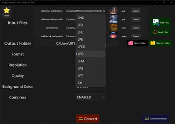 Convert 240+ Image formats to 170+ Image Formats including: HEIC, HEIF, WEBP, GIF, PNG, JPEG, ICO, PDF, TIFF, BMP, SVG, JPG & 160+ more formats Supports Conversion from HEIC / HEIF to WEBP, GIF, PNG, JPEG, JPG, ICO, PDF, TIFF, BMP, SVG & 160+ more formats Supports conversion from and to WEBP, GIF, PNG, JPEG, JPG, ICO, PDF, TIFF, BMP, SVG & 160+ more formats Supports Batch Conversion. Convert Multiple Files in one go Drag and Drop File Support Supports Resizing of the image. Change Resolution for the image Supports Compression of the images Watermark free Output High Performance & fast conversion Ad-free