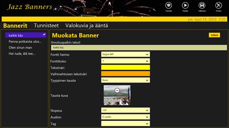 Jazz bannerit on hauska ohjelma, jota käytetään luoda julisteita ja näyttää ne Windows 8 PC. - Muokata ja tallentaa useita bannereita - Koodata jokainen banneri helppo haku - Näyttää jokaisen banner nopeasti ja helposti - Määrittää oletusarvot bannerit Jazz bannerit auttaa määrittelemään suosikki bannerin ja pitää se kätevä näyttämiseen. Valitse fontin koon ja nopeuden tehdä helpoksi lukea viestisi. - Käytä valokuva tausta - Käytä Voice over tai lisätä musiikkia
