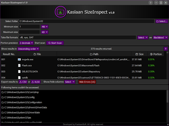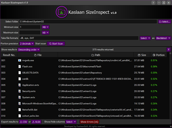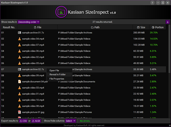 Generate comprehensive report of disk usage of a folder content. Get knowledge of what files are affecting disk usage the most. User selected folder is analyzed including all subfolders, and report is generated. Report can be configured by a number of options, prior to running the process. Individual report column can be hide or shown by the user. Each item in the report can be double-clicked to open. On right-clicking, brings a menu with few useful options. Generated report can be exported to local drive. Report results can also be sorted in Ascending and Descending order (based on Portion column).