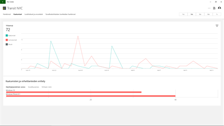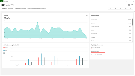 Microsoftin Kehityskeskus-sovelluksella näet nopeasti Windows-kaupan sovellusten kunnon ja suorituskyvyn kaikissa Windows 10 -laitteissa. Huomautus: Sinulla täytyy olla aktiivinen Windows-kehittäjätili, jotta voit tarkastella näitä tietoja.