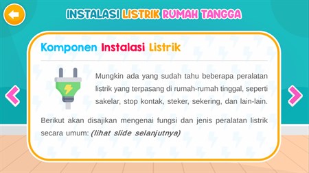 Aplikasi Edukasi Prinsip Kelistrikan dan Instalasi Listrik Rumah Tangga -Aplikasi ini berisi materi wawasan kelistrikan dasar dan materi dasar instalasi listrik rumah tangga. Selain itu terdapat juga simulasi pembuatan rangkaian listrik instalasi rumah tangga.