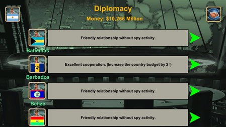 The game contains: Weapons Suppliers from around the world, a Spy Center, a War Room, Diplomats, United Nations, an Economy system, Technology, World News Distribution (Economy, Relations, Spy and War) and very advanced Artificial Intelligence.