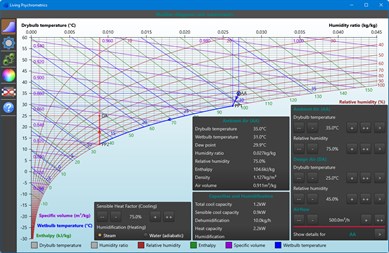 This app offers four different calculations and shows the results both in a pane and on a psychrometric diagram: 1. Air treatment Calculates how to convert a given ambient air to a required design air. The steps involved are cooling with a given sensible heat factor, dehumidifying, heating and humidifying (adiabatic or steam). Depending on the given and required air conditions, some of these steps may not be needed.