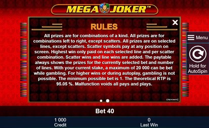 With Mega Joker, you can expect a fast-paced fruits game: Look forward to a massive amount of win lines with mega chances to win! This time the crazy joker is causing mischief on 40 (!) Mischief on the win lines: He substitutes all symbols and in the right combination helps you to crack the Mega-Winnings! Mega Joker is played on 5 reels and up to 40 win lines. Your aim is to match 3,4 or 5 identical symbols along a win line. Winning combinations start on the first reel on the left and run along an active win line to the last reel on the right in the regular game. Symbols in a winning combination must lie next to each other without any other symbols coming between them. Scatter symbols win irrelevant of win lines.