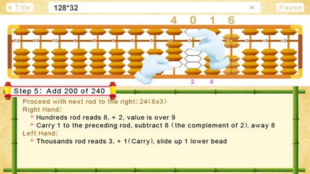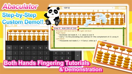 ABACULATOR A great tool that demonstrates the steps for BOTH hands abacus mental arithmetic. Just enter any multiplication equation, Abaculator will determine which rapid calculation method should be used, and show you every step with detailed description and explanation. You can pause and continue whenever you need, or even switch to show set of steps for other number or equation in the middle of the demonstration.