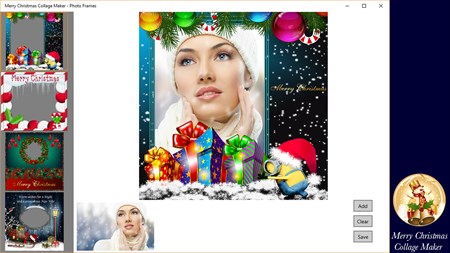 1. Select the frame you want on the left side of the app. 2. The image preview of the frame you chose will appear on the screen. 3. Click [ Add ] to add the photo you want on the frame. 4. Your photo will appear on the frame. You can add more photos if the frame allows. 5. Click [ Clear ] if you want to delete any photo you've added. 6. Click [ Save ] and select the folder you want to save your card.