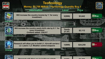 Key Features * Forge alliances and wage wars. * Utilize weapon suppliers (USA, EU, Russia, and China). * Establish a Spy Center and War Room. * Stay informed with World News (Economy, Relations, Spy, and War). * Engage with challenging Artificial Intelligence opponents.