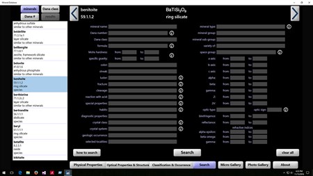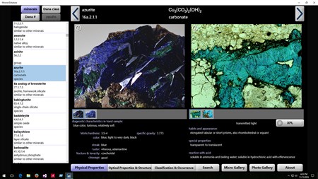 Entries for more than 300 common mineral species cover the vast majority of occurrences without presenting an overwhelming number of obscure species rarely encountered. The software provides hand sample photos, photomicrographs of thin sections, physical properties, crystal shape animations, 3D crystal structure animations, optical properties, classification, and occurrence data as well as partial data for many more species, varieties, groups, sub-groups, and series. Search for color, hardness, and streak in field and classroom uses. Use the app as a companion to a polarizing light microscope by searching for birefringence or refractive index. Identify your unknown mineral through use of any or all 54 search criteria. The comprehensive search feature allows mineral identification by using known physical properties (such as color, streak, luster etc.) or crystal and optical properties. Or, you can visually search the hand sample photos and photomicrographs using the pop-up image galleries.