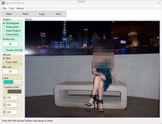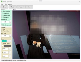Mosaics can be generated by blurring, or a solid color can fill the selected area. The blur size is editable, and solid fills can use pre-made colors or custom colors.