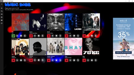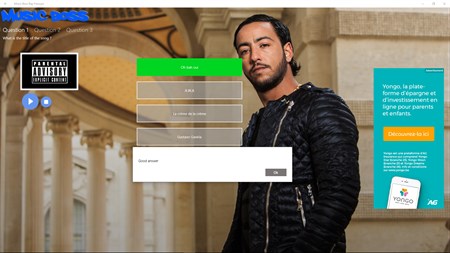 This is the ULTIMATE Test on your musical knowledge about the French Rap. Play alone or with some poeple to discover the names of the best songs or the quiz mode for the best punchlines. Several categories are available. The biggest hits, the most dancing songs of decades 90's, 2000's and since 2010 find the biggest artists: Booba, Rohff, Lacrim, PNL, Niro, Youssoupha, Lino, Nekfeu,Sch and many others.
