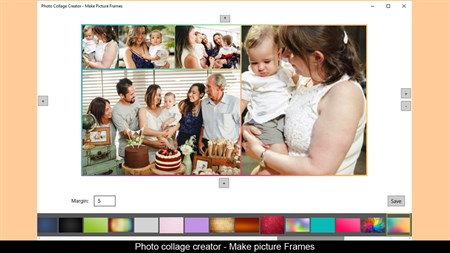 With an easy to use interface, Photo Collage Creator - Make Picture Frames allows you to create a collage selecting exactly in what side your photos will be on frame (Top, Left, Right and Bottom), you can create portraits with various photos, set the size of the space you want between the photos and set a background.